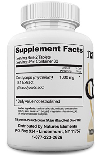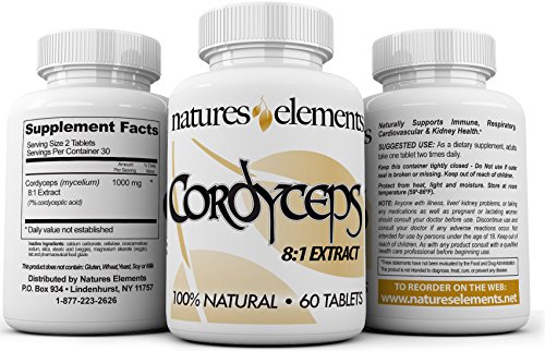 -. Feature : ★ STANDARDIZED EXTRACT: Standardized to 7% Cordyceptic Acid - Natures Elements Cordyceps is an 8:1 Standardized Extract meaning it is guaranteed and tested to contain no less than 7% Cordyceptic Acid a key constituent contained within the Mushroom. / ★ KEY BENEFITS: Supports The Immune System - Respiratory Health - Cardiovascular Health - Promotes Healthy Liver & Kidney Functions - Tibetan Cordyceps Mushroom Has Shown To Increase, Endurance, Strength & Energy To Individuals Experiencing Fatigue and more.. / ★ MORE BENEFITS: Rich In Polysaccharides - Antioxidant - Healthy Libido - Identity Guaranteed - Extra Strength - 3 Month Supply - Made In USA - Gluten Free - Vegetarian Safe - Easy To Swallow Tablets - Only 2 Tablet A Day Needed! - 100% Pure - Non GMO - GMP Quality Product - 100% Guaranteed / ★ EXCELLENCE: We use only the best 100% natural, scientifically tested ingredients, all of which are manufactured and bottled in the USA. Nature's Elements uses strict quality control procedures to ensure each product is potent, pure, safe and fresh. Each product is designed to provide exactly what you need in proper dosages to ensure absorption and effectiveness. OUR GUARANTEE: Shop with confidence with our 100% money back guarantee. / ★ WHY US: One way you can gauge the potency of your Cordyceps Sinensis is by finding out if it is an Extract. Extracts can be 10, 20 or even 100 times the potency of a powder. For Example If you compared a Cordyceps powder tablet to a Cordyceps 8:1 extract tablet you would find it would take 8 tablets of the powder to equal 1 tablet of 8:1 extract. Which one do you think offers the best results? Natures Elements only uses the best and highest quality Herbal Extracts on the market. No Powders!