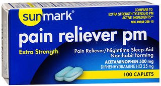 -. Title : Sunmark Pain Reliever PM, Caplets, Extra Strength - 100 caplets