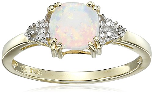-. Binding : Jewelry -. Brand : Amazon Collection -. Department : womens -. Feature : Gold ring featuring round-cut created opal flanked by triangular clusters of round-cut diamonds / Can be resized up or down 2 sizes. / Diamond color is J-K. Diamond clarity is I2-I3. / Gemstones may have been treated to improve their appearance or durability and may require special care. / All our diamond suppliers confirm that they comply with the Kimberley Process to ensure that their diamonds are conflict free. -. Label : Amazon Curated Collection -. Manufacturer : Amazon Curated Collection -. Model : B000Y8G42Q-Parent -. ProductGroup : Jewelry -. ProductTypeName : FINERING -. Publisher : Amazon Curated Collection -. Studio : Amazon Curated Collection -. Title : 10k Yellow Gold, Created Opal, and Diamond Ring