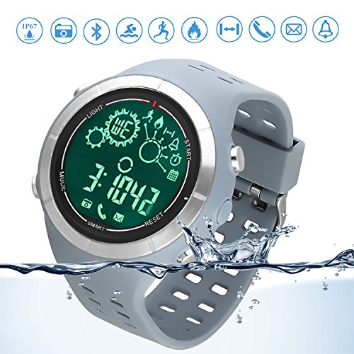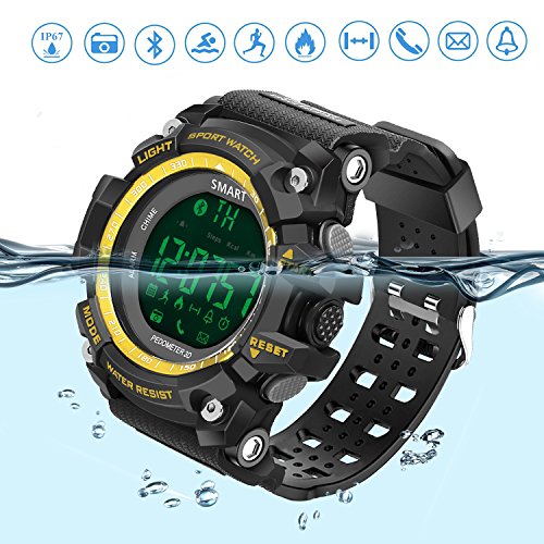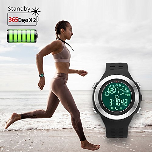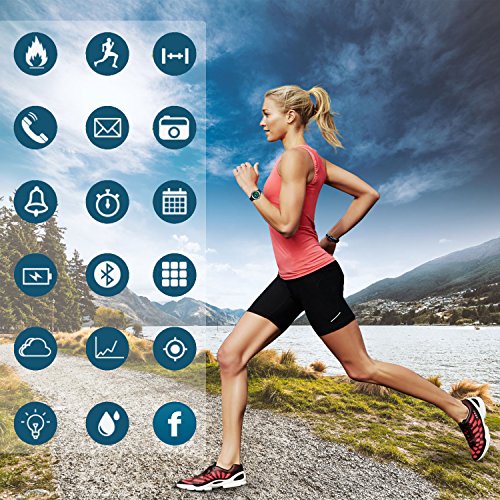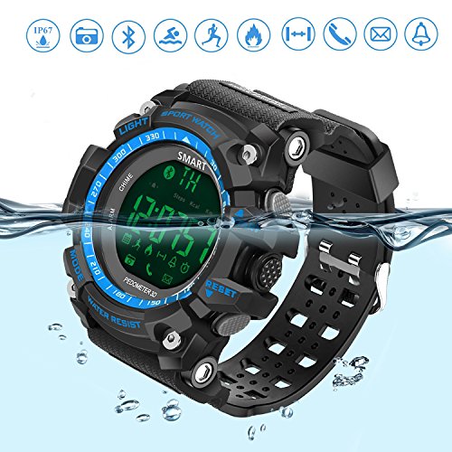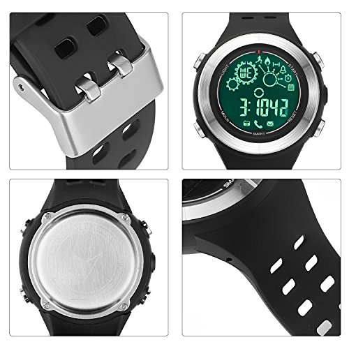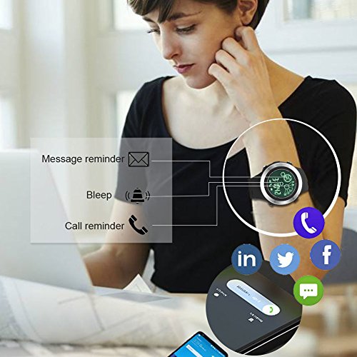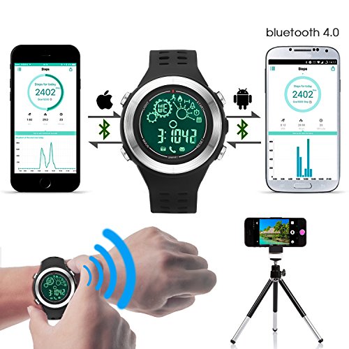 【BLUETOOTH FUNCTION】: After smart sports watch bluetooth connection with phone via APP, open camera from smartphone APP, and then press smart bluetooth sports watch S1 button as remote shutter to take photo. The smart sports watch will remind you timely about incoming call, SMS, Twitter, Facebook, Whatsapp, Skype etc message in the form of buzzer sound. Alarm, stopwatch, time display as normal watch (seconds, minute, hour, week, date) Bluetooth connection via phone within 8-10 meters