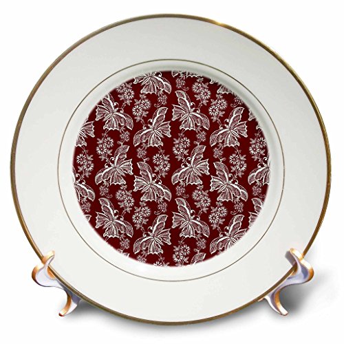 3D Rose White Lace Butterflies Over Burgundy Red Background Porcelain Plate, 8"
