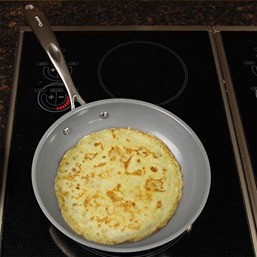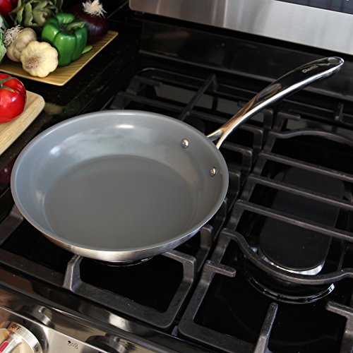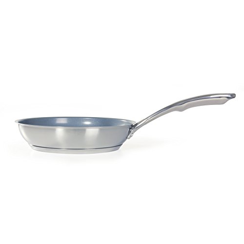 Made from strong Japanese steel, the construction and design of the Induction 21 Steel cookware line guarantee superior quality. The ceramic coating is PFOA and PTFE Free making it an eco-friendly and healthy nonstick pan. No toxic fumes are released during heating. The Fry Pan's main body has copper melted into the steel, which effortlessly conducts heat quickly and evenly. Titanium is also added for strength and durability to endure everyday cooking. To ensure healthy cooking, the steel is nickel free to prevent allergic reactions to nickel. The dripless pouring rim reduces spillage along the side of the body. This ceramic coated fry pan is the perfect choice for frying eggs, searing fish fillets, browning chicken breasts and sauteing vegetables. It features a wide flat bottom, sloped sides and a cool to the touch, long ergonomic handle. This is the best steel for magnetic induction and perfect for all cooktops. Oven safe up to 500 DegreeF. Hand wash only. Limited 2 year warranty. Product dimensions: 2" height, 9.5" opening diameter, 7.25" exterior base diameter.Feature