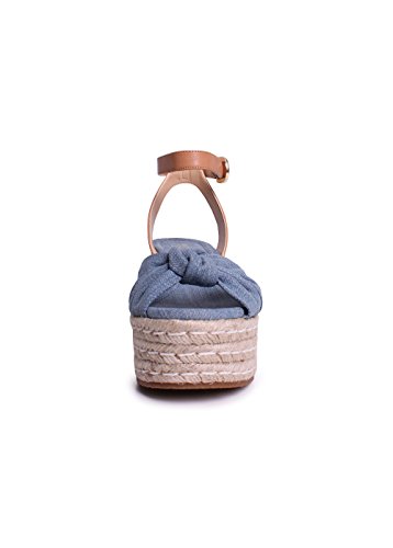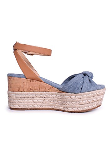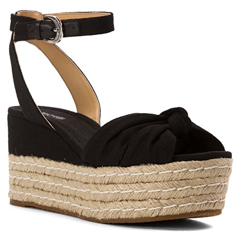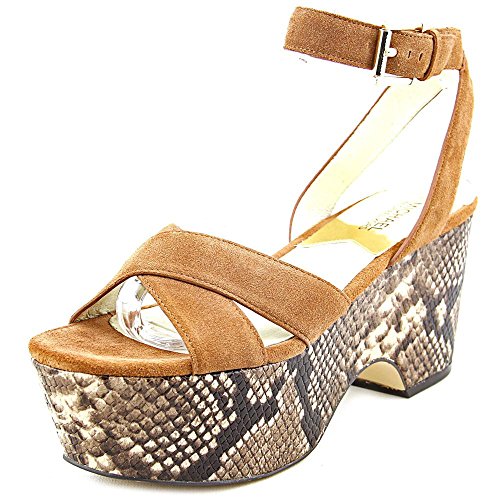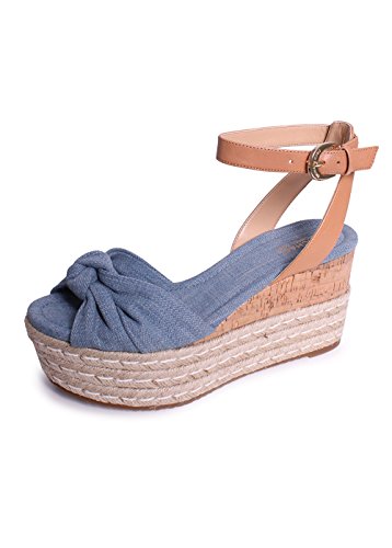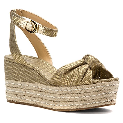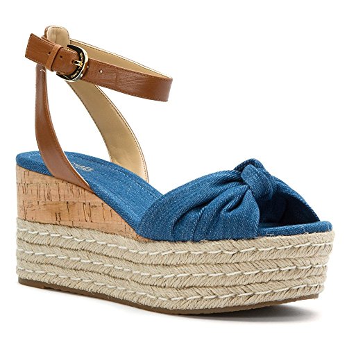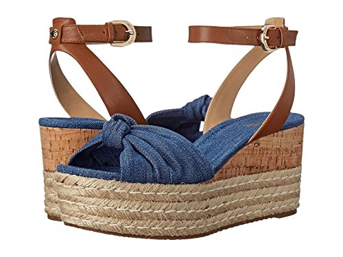 Step out in style in these must-have wedges by Michael Kors! Featuring a denim bow detail on the upper and an adorable open toe style, these sandals are ideal for your warm weather collection. 3.25-in. heel, 1.75-in. platform height Padded insole