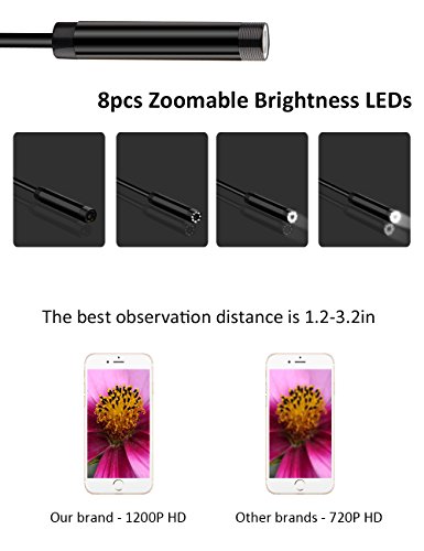 - 【HD INSPECTION CAMERA + IP68 WATERPROOF】We updated it to 1200P with 8 LED adjustable brightness 8mm OD lights,to improve definition and visibility in dark or low-light areas, help you inspecting better in multiple environment. It supports 1600*1200, 1280*720, 640*480