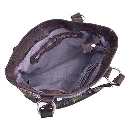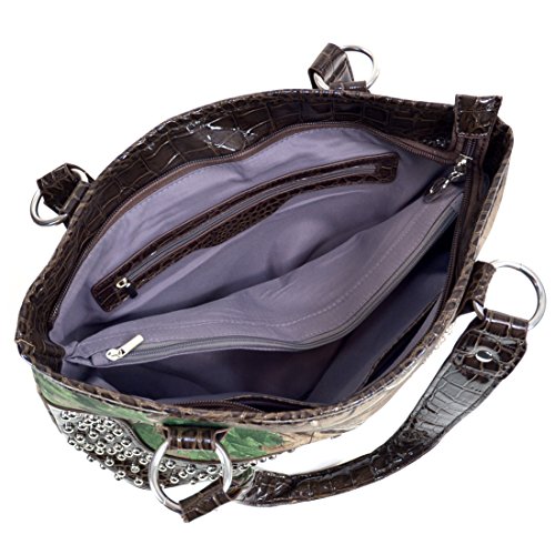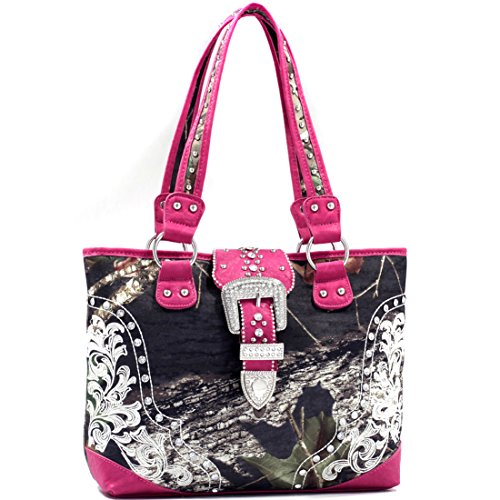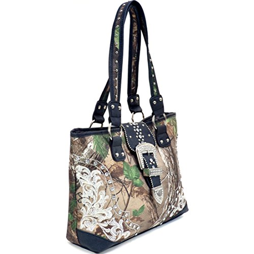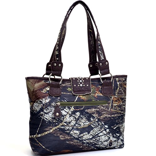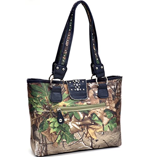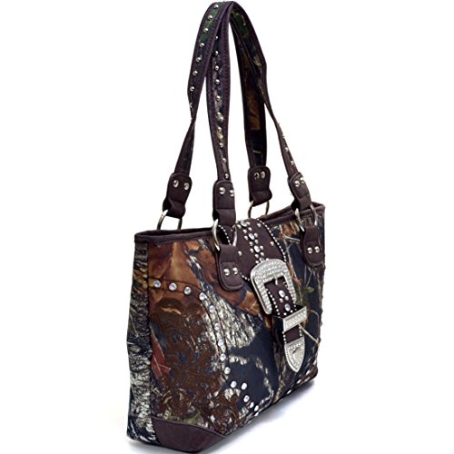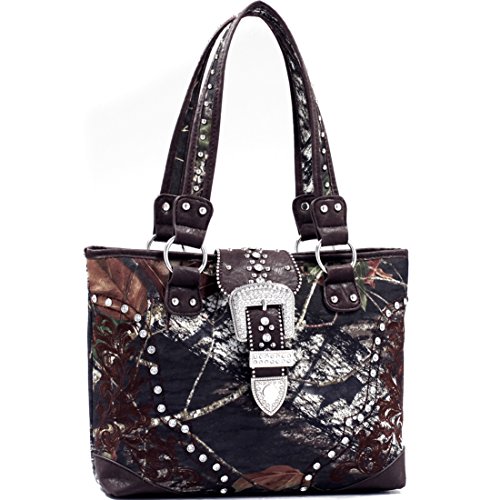 Product Description *Little leather smell is normal. Open it and put it in a ventilated environment for few days, the smell will disappear. *Due to different camera, light environment and display, the physical color will be a little different from pictures. An elegantly embroidered floral design front panel adds simple femininity to this Rhinestone studded camouflage tote. The stunning buckle accent of this deep bodied tote bag makes pairing your favorite outfits and jewelry a breeze. The depth and quality of the Realtree? Camouflage print features all the complexity of other Realtree? camo designs but with an added pop of spring color. The soft brown/beige fabric interior features convenient open top pouch pockets and large back wall zipper pocket as well as three built in, easy to reach fabric card slots! Faux Leather Top Zipper Closure Rhinestone Studded Buckle Accent on Magnetic Snap Closure External Back Zipper Pocket Faux Leather Flat Bottom Design Studded Silver Tone Shoulder Strap Interior Fabric Card Slots Interior Open Top Pouch Cell Phone and Item Pocket Interior Back Wall Zipper Pocket Matching Silver Tone Zipper Pulls, Rings and Studs Approx. Size: 15.25"W x 10.25"H x 3.5"D Strap Drop Length: 12.5' 0
