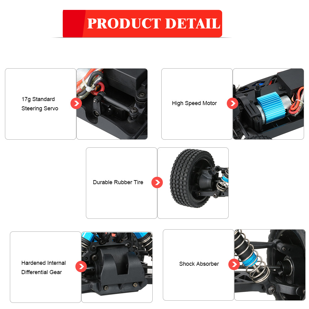 It features 1/16 scale high speed off-road car, equipped with 2.4GHz radio system ready to race, four-wheel drive system and shock absorption and collision avoidance design, and independent metal differential, which can steadily move forward and backward, turn left and right. The body structure, vehicle components, rocker arm, are used of nylon materials engineering, gear with zinc alloy, so it is durable to use. Come and get it.