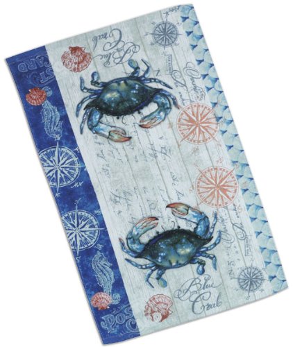 - Terrycloth towel has colorful blue crab and shells on sea green background, with deep blue edge stripe; measure 16 inches by 26 inches