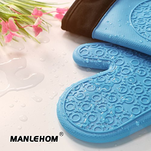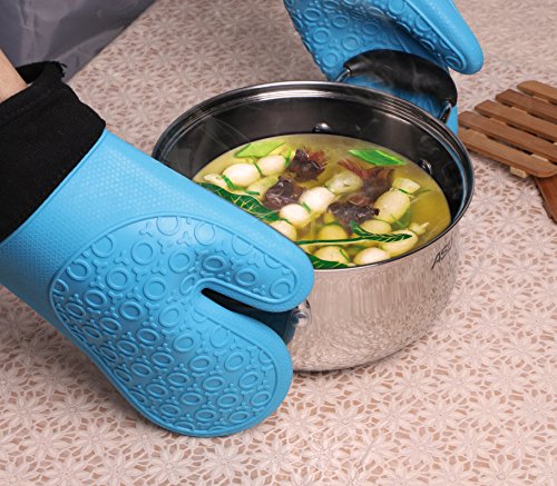 - Quilted oven mitt with design on front and back; measures 13 inches long