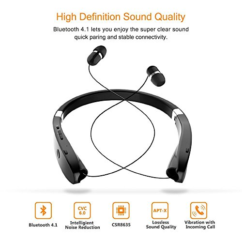 -. Feature : Foldable Design: retractable earbuds and lighter weight, more flexible and convenient to carry on the go. Sweatproof, handsfree and foldable design perfect for outdoor sports. / Long Battery Life: after a 3.5 h full charge,about stand-by time up to 300 hours,16 hours music time,18 hours talking time.With LED indicator light to show whether it in matching digital equipment or charging the headphone. / Vibration and Voice Prompt: the Bluetooth headset will remind you with vibration when a call comes.will never miss any phone call when you are doing exercise or even you in the noisy environment. / Bluetooth 4.1 Stereo Music Sound: CVC 6.0 Noise cancellation technology to ensure high quality music and clear phone calls. / Built-in Mic, Hands-free calling: digital signal processing (DSP) and HD Voice clarity, make your conversations come out clearly at the other end.Having the freedom to move around hands-free while in those long boring conference calls, without the hassle of wires dangling around your body.