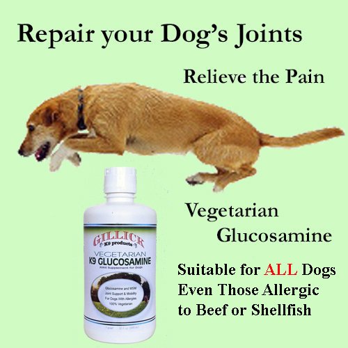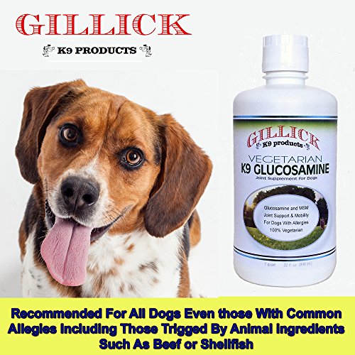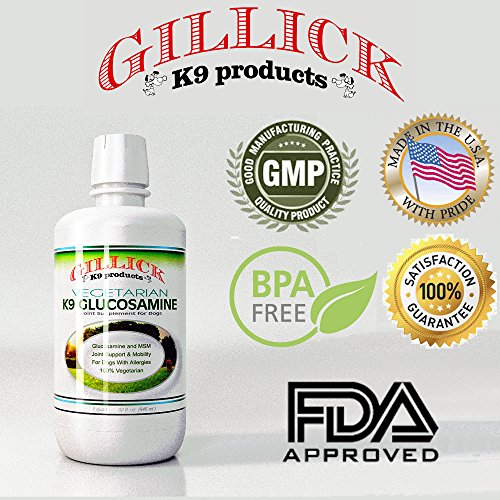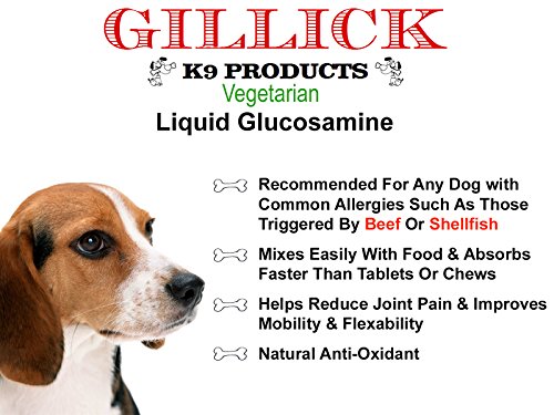 -. Feature : GILLICK K9 PRODUCTS LIQUID VEGETARIAN K9 GLUCOSAMINE Joint Supplement for dogs is suitable for ALL dogs even those with common allergies, including those triggered by animal-base ingredients such as beef or shellfish. It is 100% vegetarian and contains NO shellfish or beef. / GLUCOSAMINE and MSM recommended by Veterinarians for the relief of joint pain Arthritis. hip dysplasia, inflammation and stiffness in dogs of all sizes, breed and age. Give to young dogs as a preventative measure to avoid joint problems later in their lives. Being a liquid it allows STRESS FREE administration and is far more effective than chews or tablets giving quicker results. / OFFERS BETTER VALUE than other Hyaluronic formulas that lack essential nutrients like MSM, Vitamin C, Grape Seed Extract, Maganese, Boron and Omega Essential Fatty Acids. Our Natural Organic supplement only uses the best ingredients available. It is manufactured in a FDA and cGMP (Good Manufacturing Practices) certified facility in the USA with over 20 years' experience in the manufacture of Liquid supplements. / OUR CANINE VEGETARIAN LIQUID GLUCOSAMINE SUPPLEMENT replaces Chondroitin Sulfate (only available from animal sources) with USP grade Glucosamine derived from vegetable sources. It's also supported by various minerals, omega fatty acids and antioxidants to provide a full spectrum of beneficial joint ingredients to help repair your dog's joint tissue maintaining mobility and further lubricating and cushioning the joint. / UNCONDITIONAL GUARANTEE We are so confident with our product having spent time researching to ensure that our glucosamine for dogs is the best available, that if you are not completely satisfied with our product we will give you a full refund.
