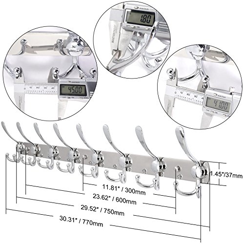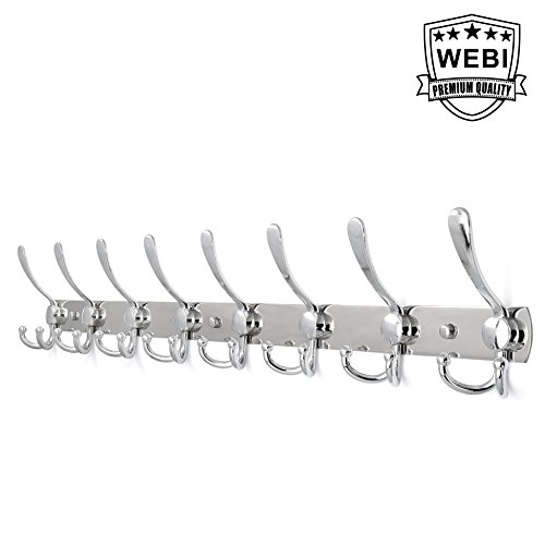 WEBI Sturdy Wall Mounted Tri-Hook Coat Rack/8 hooks,30 Inches, Aluminum/Chrome Finish