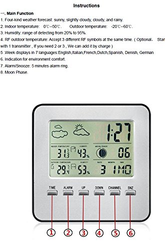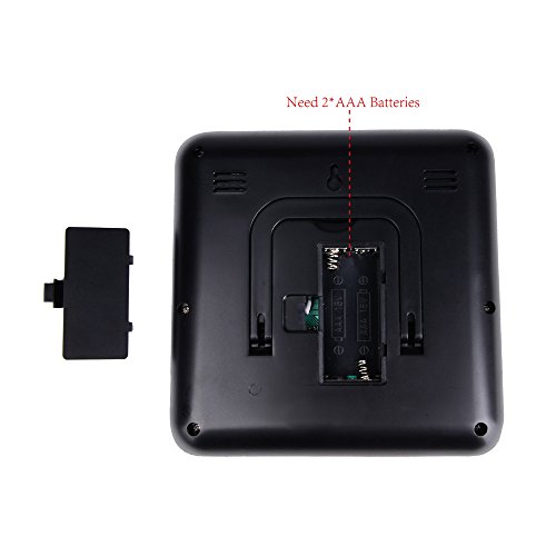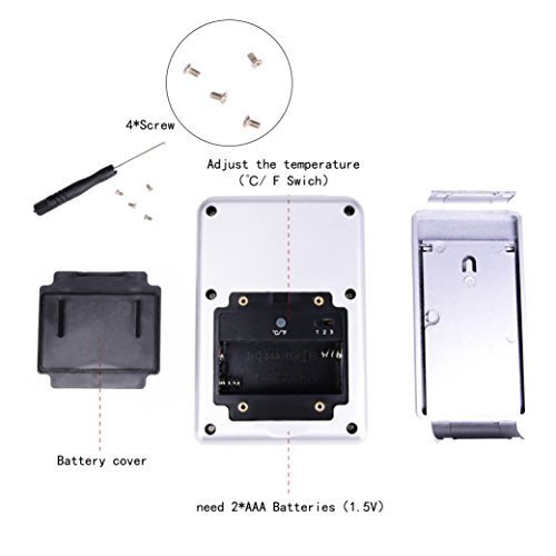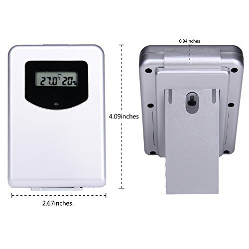 -. Feature : We created the digital thermometer which provides accurate data from indoor and outdoor every 35 seconds. It supports both Fahrenheit and Celsius. / The smart digital thermometer can recognize the indoor and the outdoors temperature, humidity, moon phase, date, hours and sight of the weather (sunny, sunny cloudy, cloudy, rain). / Easy to read large LED screen with artful design for a fast understanding of the current weather. Easy setting so everyone can use it and read it. / The digital thermometer comes with a wireless transmitter within 330ft range. / The devices are powered by AA batteries (not included) 2 for the weather station and 2 for the transmitter.