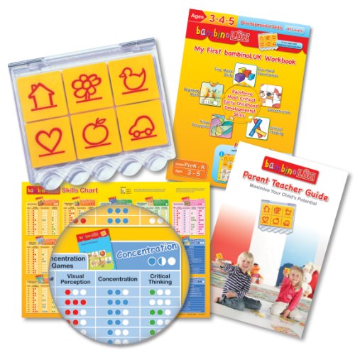 bambinoLUK is a play and learn system to reinforce early childhood developmental skills such as visual perception, concentration, critical thinking, beginning math, fine motor skills, eye-hand coordination, self-esteem, and everyday knowledge. It features an easy to use 6-tile controller with self-checking design and a series of well illustrated workbooks focusing on various developmental skills. Start the enjoyable learning experience with this bambinoLUK Starter Pack. The package includes: * bambinoLUK Controller - necessary for use with all bambinoLUK workbooks * My First bambinoLUK Workbook - 66 exercises provide an overview of the entire early learning series * Parent Teacher Guide - complete reference to maximize children's learning using bambinoLUK * bambinoLUK Skills Chart - detailed rating levels for every exercise in this series * Free access to additional parent/teacher resources including DIY templates to design your own exercises.Feature