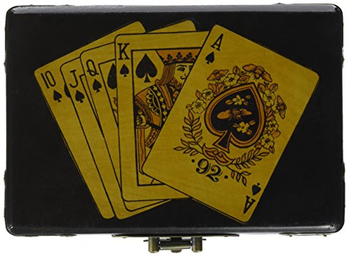 - 7"w by 5"d by 2"h, oriental style black laquered case, hand painted poker art