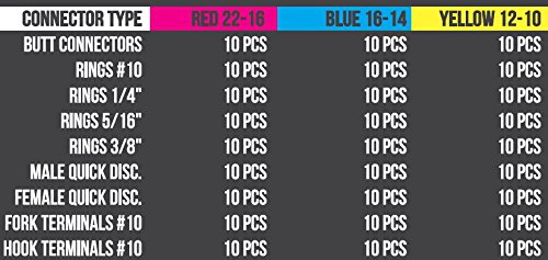 - THE RIGHT CONNECTORS: Complete the job or project with the right connector butts, forks, hooks, quick disconnects, and rings for automotive, marine, stereo, or any other electric oriented project. Compatible with AC and DC current.
