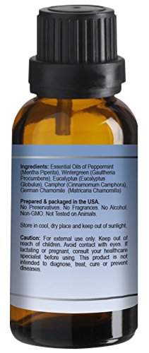 - NEW PRODUCT - Premium Quality, Pure Essential Oil Blend. Contains: Peppermint, Wintergreen, Eucalyptus, Camphor, German Chamomile Oil.