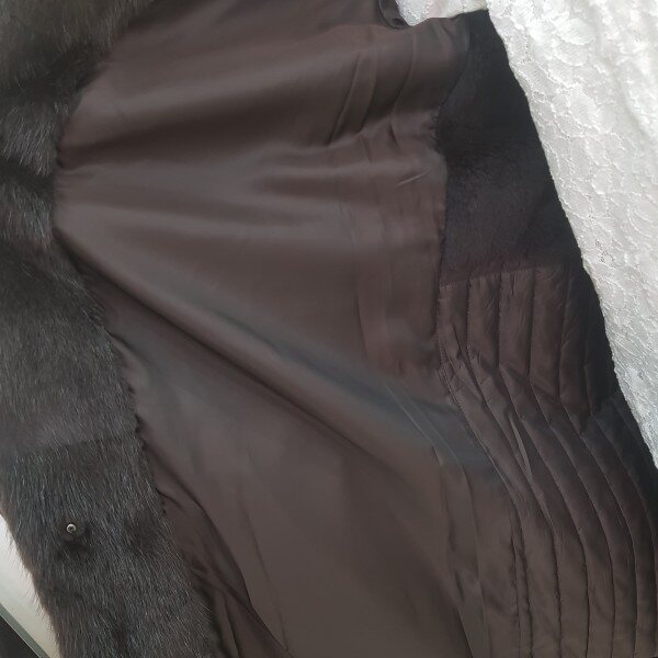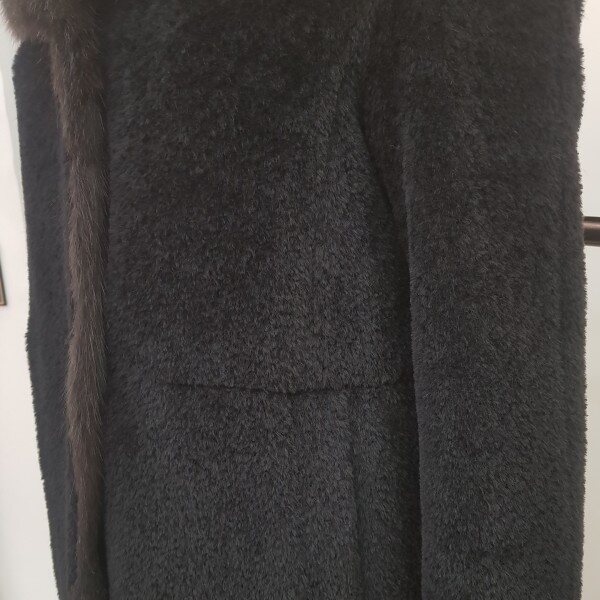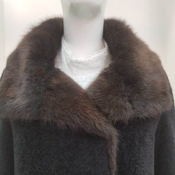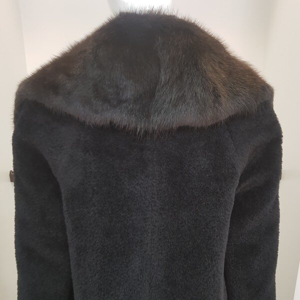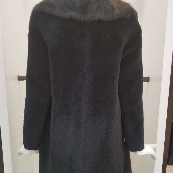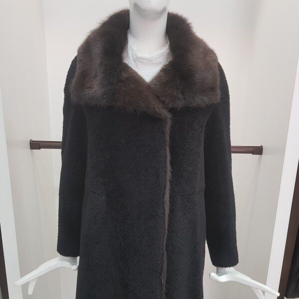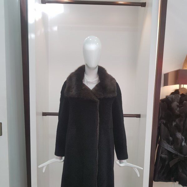 머스크렛퍼카라로 고급스러움을 주고 퍼안감으로 보온성이 높고 루즈핏 밴드형 퍼코트