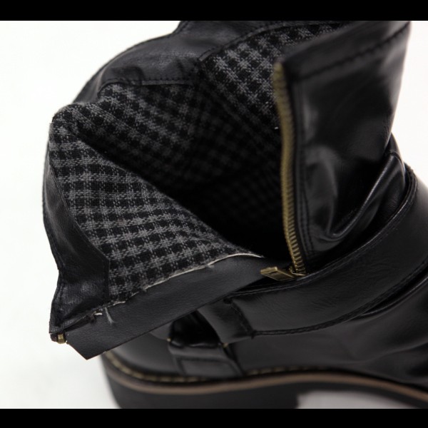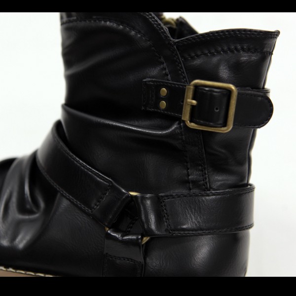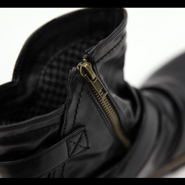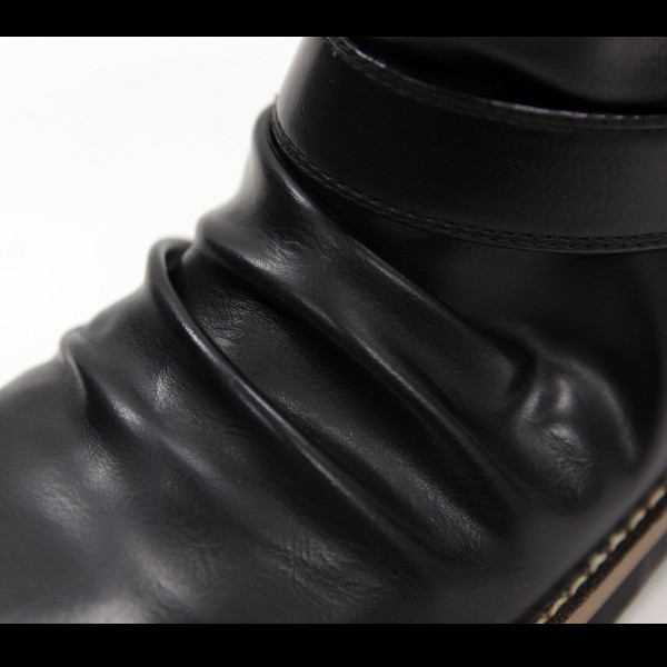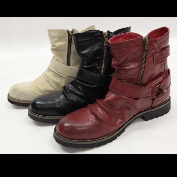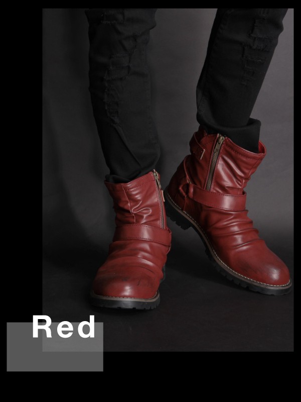 程よいドレープ感とヴィンテージ加工が特徴のZIPアップエンジニアブーツの登場。 サイドのZIPとショート丈デザインにより、ブーツにありがちな脱ぎ履きのストレスを軽減。 さらにベルトデザインやリング使いのバランスもよく、シンプルなデザインでありながらスタイルを問わず様々なコーディネートに使えます! つま先やかかとに施されたヴィンテージ加工の風合いも魅力的です。 BLACK、REDはレザータッチ仕様、BEIGEはスウェードタッチ仕様の3色展開。