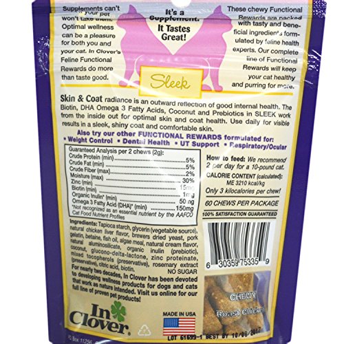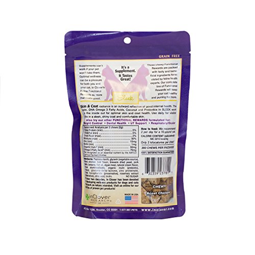 Sleek manages shedding and hairballs while restoring coat luster with critical fatty acids, essential nutrients and luscious coconut oil. Keep your kitty looking and feeling great with Sleek skin & coat care from In Clover. Developed by animal health experts, Sleek supplies your feline friend with clinical levels of naturally nourishing ingredients. Critical omega-3 fatty acids, biotin, zinc coconut oil and prebiotics work from the inside out for healthy skin and radiant coat. Sleek's scientific formula increases skin hydration, encourages hair follicle repair, manages shedding and controls hairballs. Give daily for optimal results.