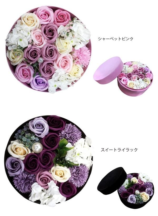 | 石けん素材で作られたフラワーアートです。優しいシャーベットピンクと、シックなスイートライラックの2色展開。プレゼントはもちろん、ご自宅のインテリアとしても最適です。 |