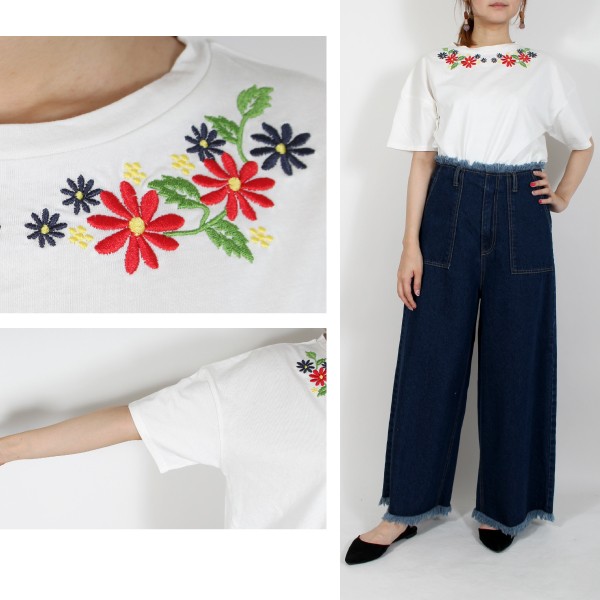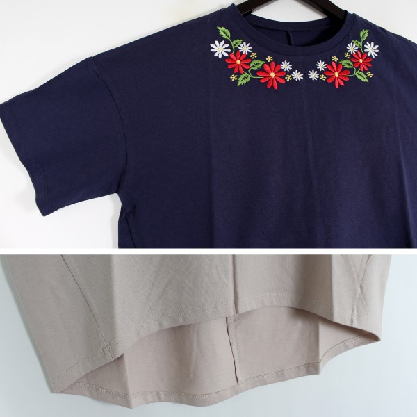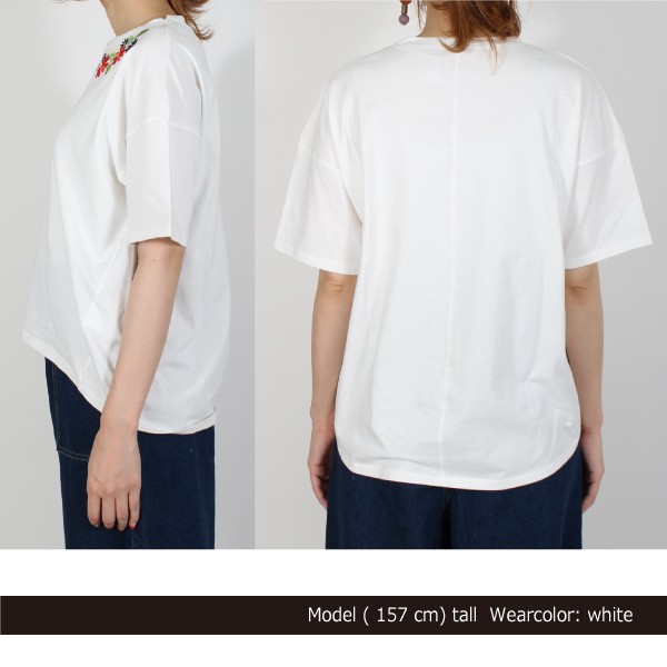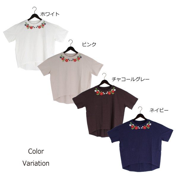 | サイズ | Mサイズ | | 実寸 | 着丈:F55B65cm 、肩幅:60cm、バスト:55cm、袖丈:15cm、袖口:17cm、裾巾:50cm | | 素材 | 本体 綿100% 刺繍糸 ポリエステル100% | | 生産国 | 中国 | | 裏地 | なし | | 生地の伸縮 | なし | | 生地の透け感 | なし | | カラー | 01. ホワイト 02. ピンク 03. チャコールグレー 04. ネイビー | | 注意点 | ▼綿混合商品は洗濯時に多少縮む事がございます。 ▼パソコン、モニター等の環境により、実際の商品素材カラーが多少異なる場合が御座います。予めご了承ください。 ▼お手数ですが必ずお買い物ガイドを一読頂いてからご利用いただきますようお願い申し上げます。 | |