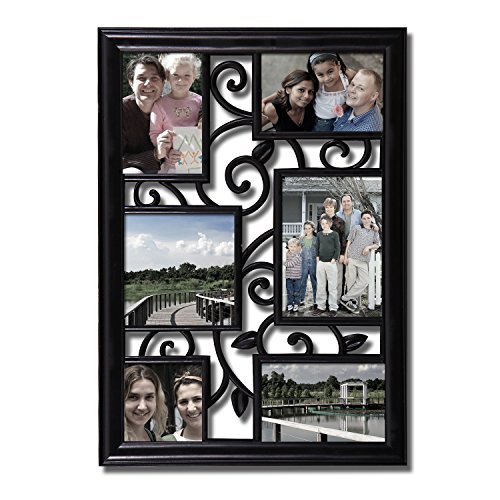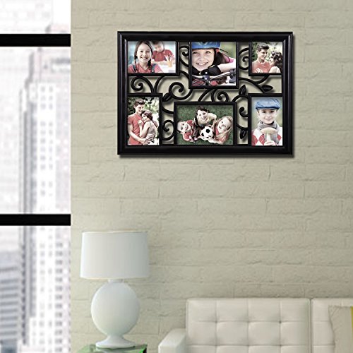-. Feature : Matte black finish / Materials: polypropylene, glass / Holds 6 images; 3-4x6 and one each 4x4, 5x7, 5.5x5.5 / Decorative filigree background / Vertical and horizontal hanging options