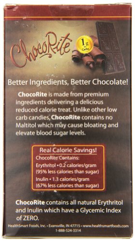 -. Feature : Sugar-free, with 1g effective carbs you'd swear these bars are "real" chocolate / Made from all-natural, premium ingredients that deliver a delicious reduced calorie treat / Unlike other low carb candies, ChocoRite contains no maltitol which may cause bloating and elevate blood sugar levels / ChocoRite contains all-natural Erythritol and Inulin which have a glycemic index of zero
