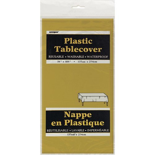 - Feature : 1 Gold Plastic Table Cover / Gold Plastic Table Cover measures 54 by 108" / Protects your party table against spills and stains / Disposable tableware makes after party clean up easy / Search for other Gold party supplies, Gold tableware, or any other solid color tableware from unique