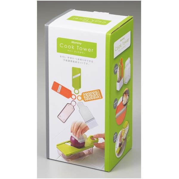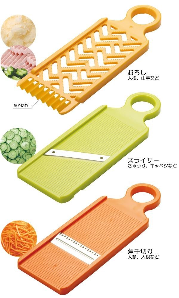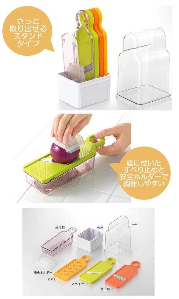 おろし・スライス・角千切りができる万能調理器セット。コンパクトに収納できキッチンでの置き場所に困りません。調理プレート3種はタテに収納しますので、フードを外せばサッと取り出せます。各プレートにセットできる受け皿・安全ホルダーが付いています。 |