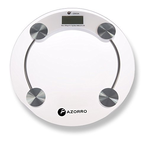 -. Brand : Azorro -. Color : transparent -. EAN : 0850660004524 -. Feature : "Step-and-Read" - Immediate readings as soon as you step on the scale; Measurement Range:11lb-396lb(5kg-180kg) / High accuracy - 4 latest-version high-precision sensors, HIGH QUALITY / Extra large LCD display with cool design and large font numbers (22mm font display) - Easy to read from a distance / Auto-calibrated and automatically turns off to conserve battery life; runs on 1 CR2032 (3V) battery (battery included) / Extra thick and sturdy tempered glass top (the thickest in Amazon.com) for safety and large 13 inches diameter platform, 100% Azorro satisfaction guarantee -. Model : 5848057 -. MPN : AZBS201W -. NumberOfItems : 1 -. PartNumber : AZBS201W -. ProductGroup : Home -. ProductTypeName : HOME_BED_AND_BATH -. Title : Precision Digital Bath Scale (396 Lbs Edition) - By Azorro - High Accuracy Premium Body Weight Scale -. UPC : 850660004524