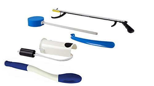 Perfect Tools for Anyone With Limited Mobility Regain your independence to do those everyday activities that have become a challenge with the BodyHealt 5-Piece Standard Hip Knee Replacement Kit Set. Ideal for anyone who has limited mobility of their body due to surgery, an injury or a debilitating condition, these aids provide the assistance needed to promote your independence and make you feel whole again. The durable construction and white and blue color palette will appeal to men and women of any age. Reaching for Items Will No Longer Be a Problem. The kits include a 26" reacher to aid in grabbing items that are hard to reach. The jaw opens up so you can conveniently grab items on the floor, underneath the bed, in a cabinet or up on a high shelf. Furthermore, it provides a tight grip that makes it easy to grasp both small and bulky items. Putting on Socks Is a Cinch. An essential item included in the kit is the 2-handle sock aid ? designed to hold socks and stockings over the heel. A foam patch holds the sock in place, while the long loop handles allow the user to pull the sock onto their foot and leg with ease. Regain Your Independence With the Right Aids. The long handle sponge makes it easier to wash those hard-to-reach places when you're unable to bend after surgery. It has a sturdy, plastic handle for durability and a soft foam sponge that is gentle on sensitive skin, while the hole at the end allows you to easily hang on any hook. ? 0 |