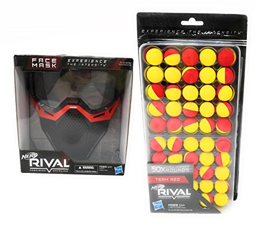 -. Binding : Toy -. Brand : Nerf -. Color : Red -. Feature : Includes 1 Nerf Rival Face mask / Includes 50 round refill pack for your nerf rival gun / Experience the intensity with this face mask and round bullets / Nerf rival mask has an adjustable elastic band and breathable design keep you comfortable as you battle / Perfect for playing Nerf together with family and friends -. Label : Nerf -. Manufacturer : Nerf -. ProductGroup : Toy -. ProductTypeName : TOYS_AND_GAMES -. Publisher : Nerf -. Size : Bundle -. Studio : Nerf -. Title : Nerf Rival Face Mask and 50 Round Refill Pack Bundle, Red
