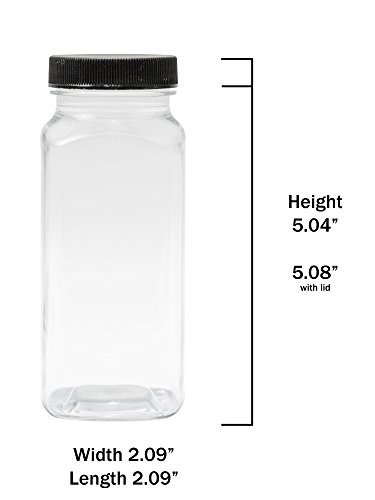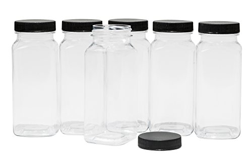 CLEAR PLASTIC SQUARE BOTTLES - 8 OZ REFILLABLE CONTAINERS, 6-PACK - BLACK LIDS - ORGANIZE YOUR KITCHEN, CRAFT ROOM, GARAGE OR CREATE WEDDING AND PARTY FAVORS - BONUS ONE 2 OZ MATCHING BOTTLE
