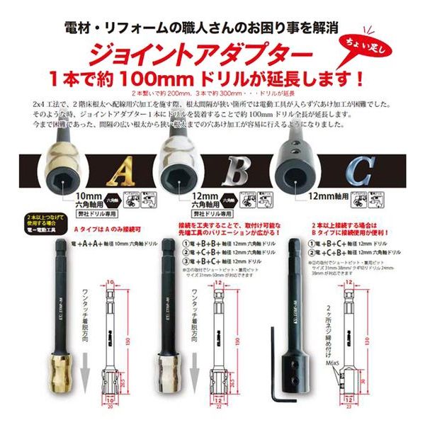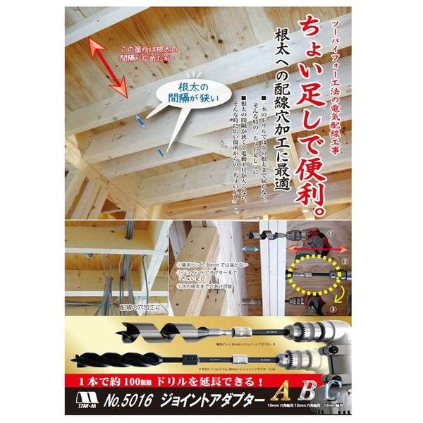 ●1本のドリルでは次の根太まで届かない、根太の間隔が狭くて電動工具が入らない時の「ちょい足し」に。