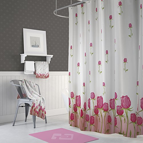 Fabric Pink Roses Shower Curtain with Hooks, Floral Beauty and Spring Themed Ombre Design for Bathroom, White 72 x 78 Inches