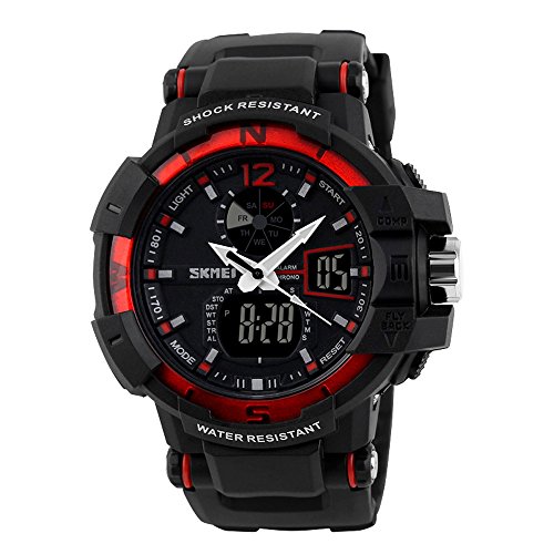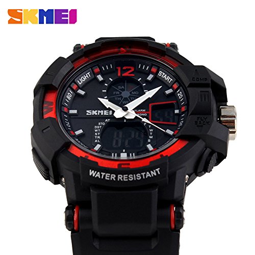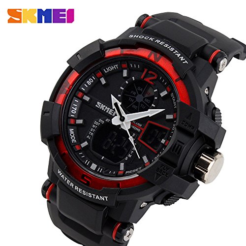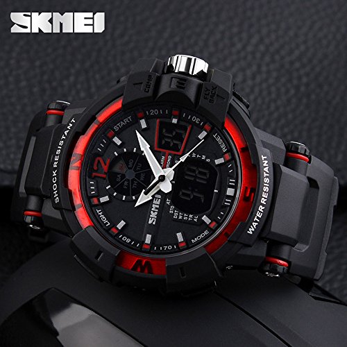 -. Feature : 164FT WATERPROOF: 164 ft waterproof (50 M) - 5ATM water resistant. NOTE: please DO NOT press any buttons in the water. / DUAL DIAL TWO TIMEZONE: analog and digital dual dial support two different timezone. Shock resistant, stop watch, military 12H/24H time, and LED back light functions make it perfect for all kind of sport and daily use. / COMFORT with FASHION: silicon rubber watch band with the large dual dial design make it comfortable to wear and lead you to edge sport fashion. Perfect for both indoor and outdoor activities. / MULTI-FUNCTIONAL: Dual Timezone, Calendar Day and Date, Alarm, Water Resistant, LED Display, Back Light, Shock Resistant, Stop Watch.