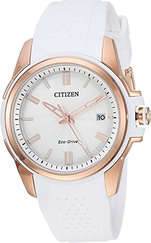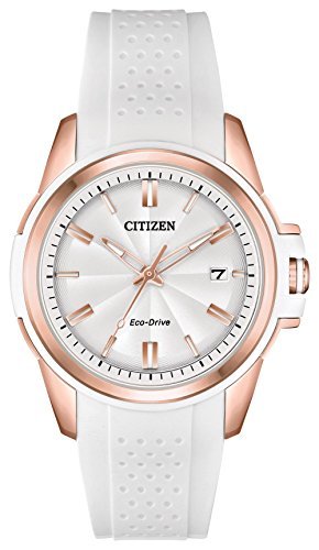 Watch Sizing Guide Citizen Eco-Drive™ FAQ Give your sport-chic look a bold detail with this Citizen® watch. Stainless steel case. Silicone strap with adjustable buckle closure. Round face. Three-hand analog display with quartz movement. Dial features rose gold-tone hands and hour markers, date display window, minute track, and Citizen detailing. Water resistant. Display case included. Imported. Citizen Watch offers a five-year limited manufacturer's warranty on all their products. For more information, please visit their website and see the "Service Information" section. Measurements: Case Height: 35 mm Case Width: 39 mm Case Depth: 11 mm Band Width: 16 mm Band Circumference/Length: 9 1⁄2 in Weight: 2 oz This product may have a manufacturer's warranty. Please visit the manufacturer's website or contact us at warranty@support.zappos.com for full manufacturer warranty details.Feature