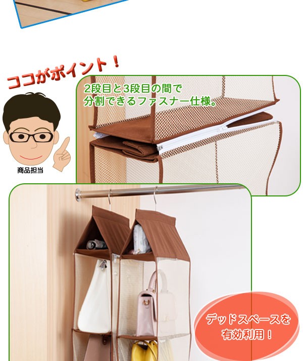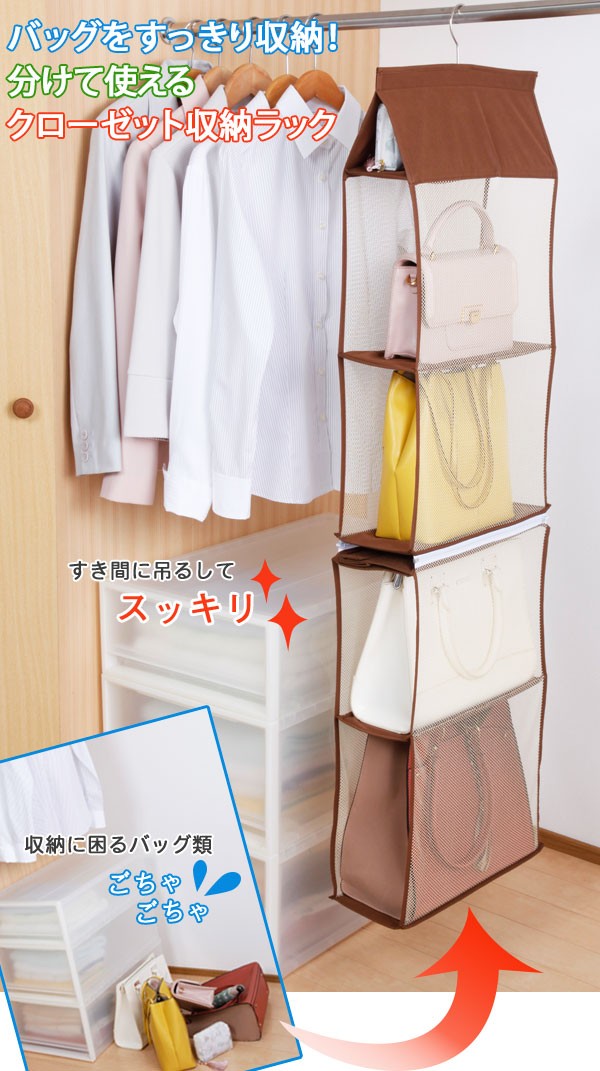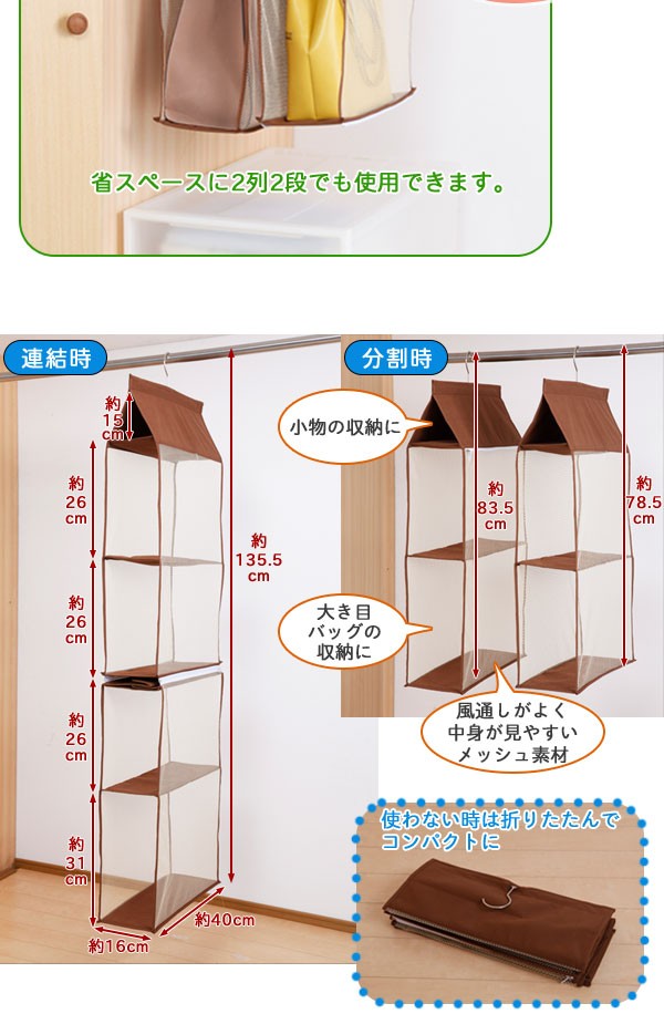 | <h1>クローゼットの中で収納に困るバッグ類をひとまとめにスッキリ保管できる吊るす収納ラック。1列4段でスリムに使用できるほか、2段目と3段目の間で分割できるファスナー仕様になっており省スペースに2列2段でも使用でき、チェストの上部などデッドスペースを有効活用できます。風通しがよく中身が見やすいメッシュ素材。/バッグ収納/かばん収納/鞄収納/クローゼット収納/分割/セパレート/ハンガー付き/</h1> |