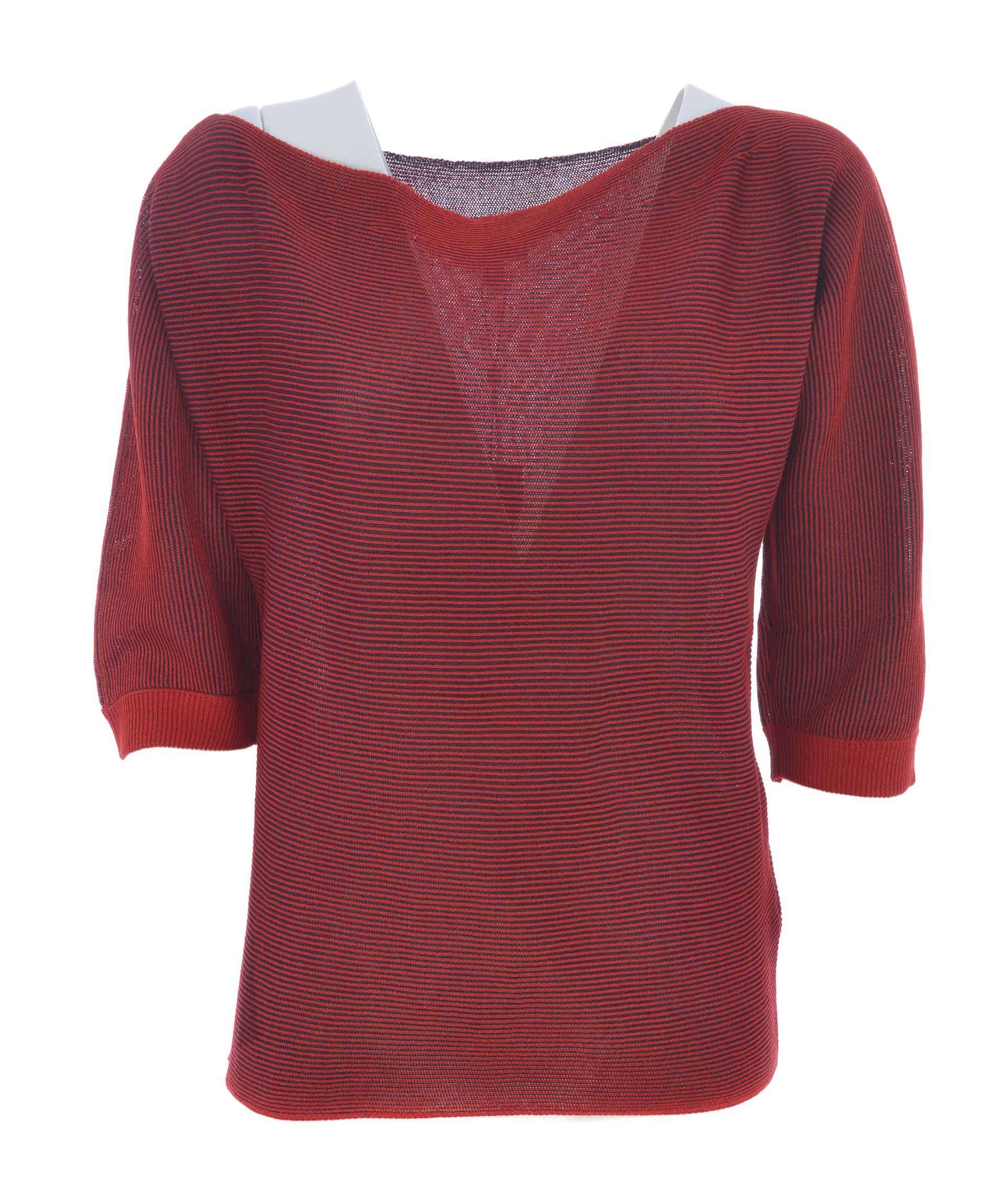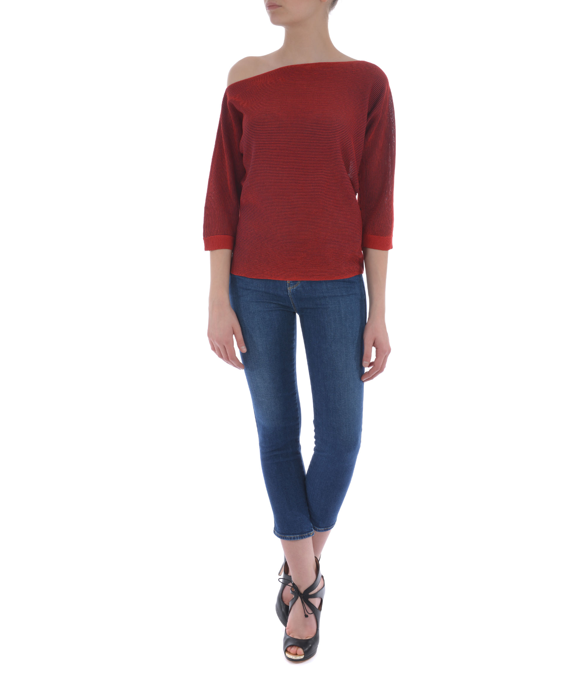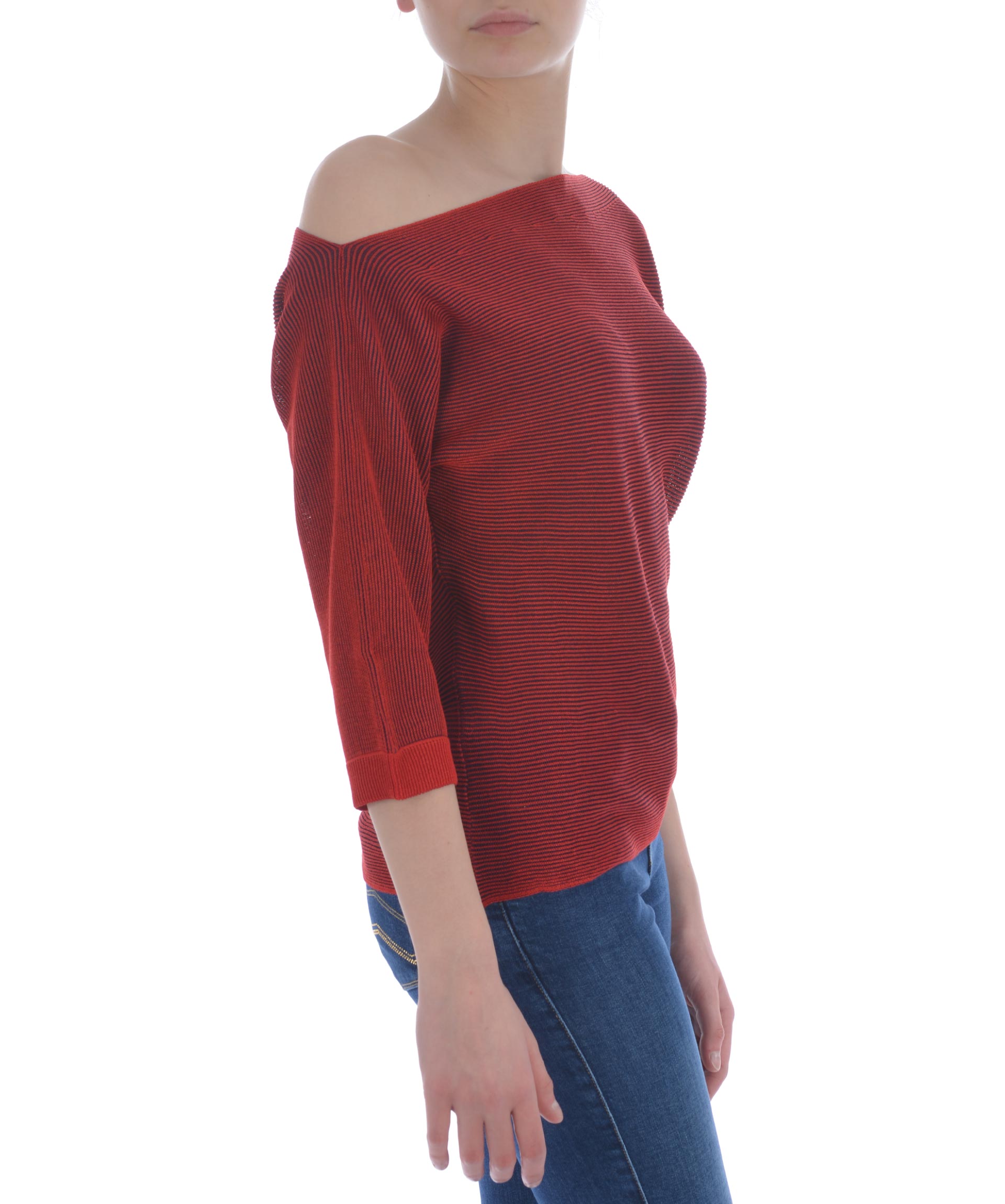 Maglia Armani Jeans in filato jacquard di misto viscosa Rosso/Blu scuro. Tessuto groffato. Inserti in lurex. Scollo asimmetrico. Spalla destra scoperta. Manica 3/4. Misura in foto 42 75% viscosa, 25% poliestere