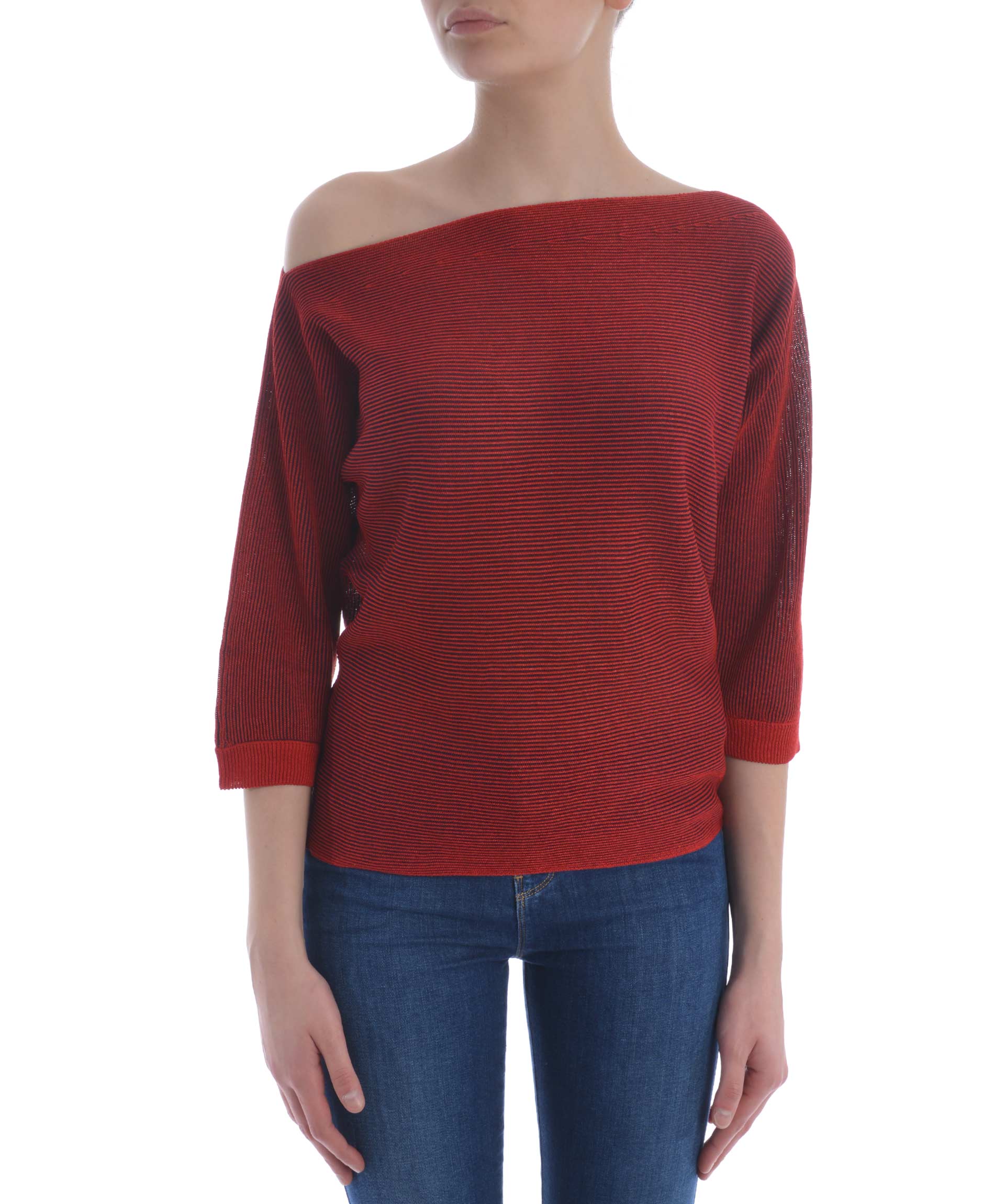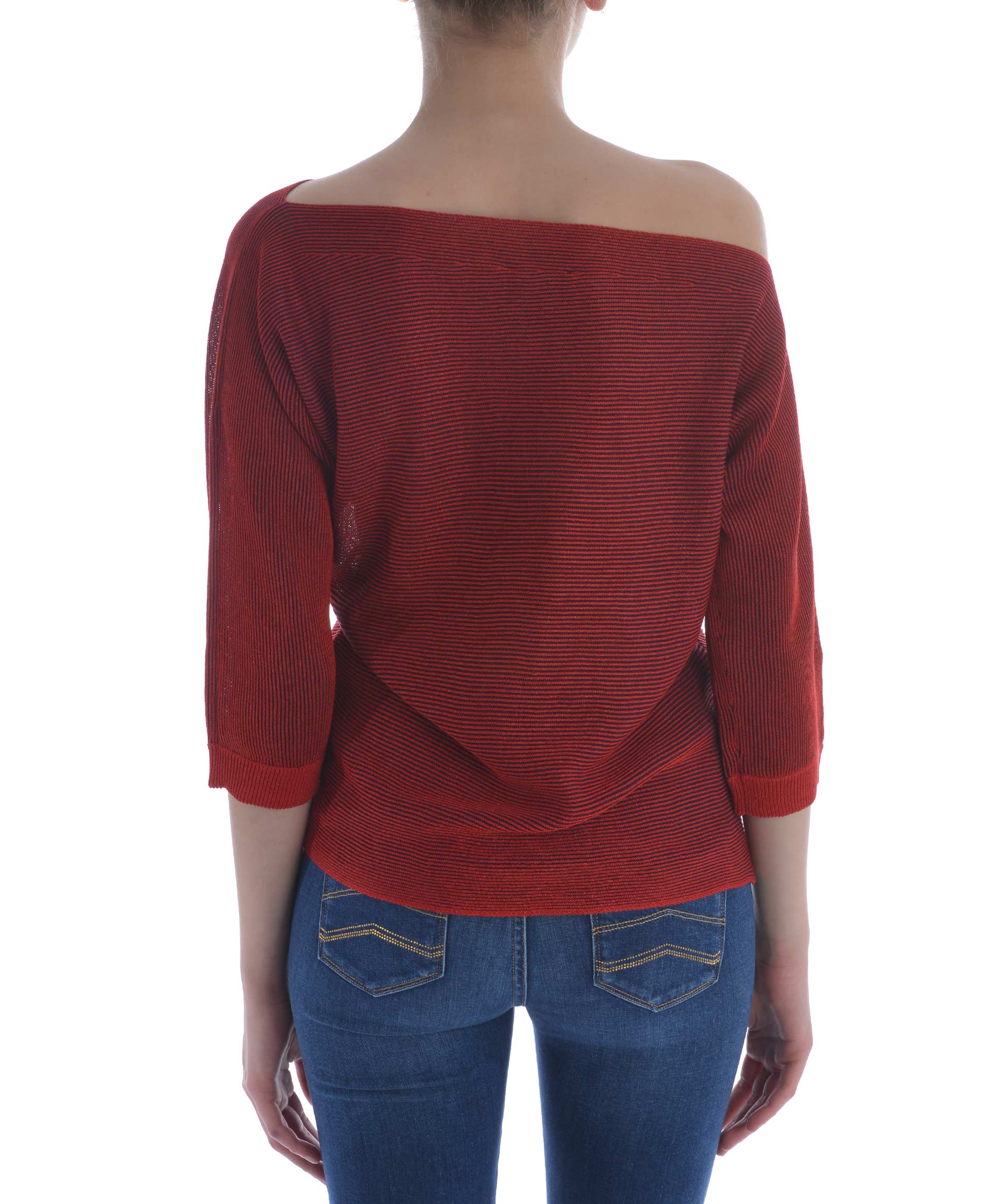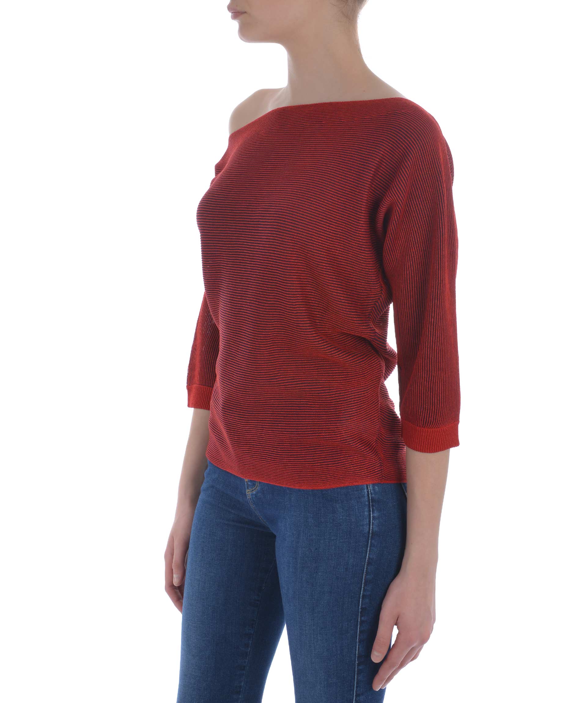 Maglia Armani Jeans in filato jacquard di misto viscosa Rosso/Blu scuro. Tessuto groffato. Inserti in lurex. Scollo asimmetrico. Spalla destra scoperta. Manica 3/4. Misura in foto 42 75% viscosa, 25% poliestere