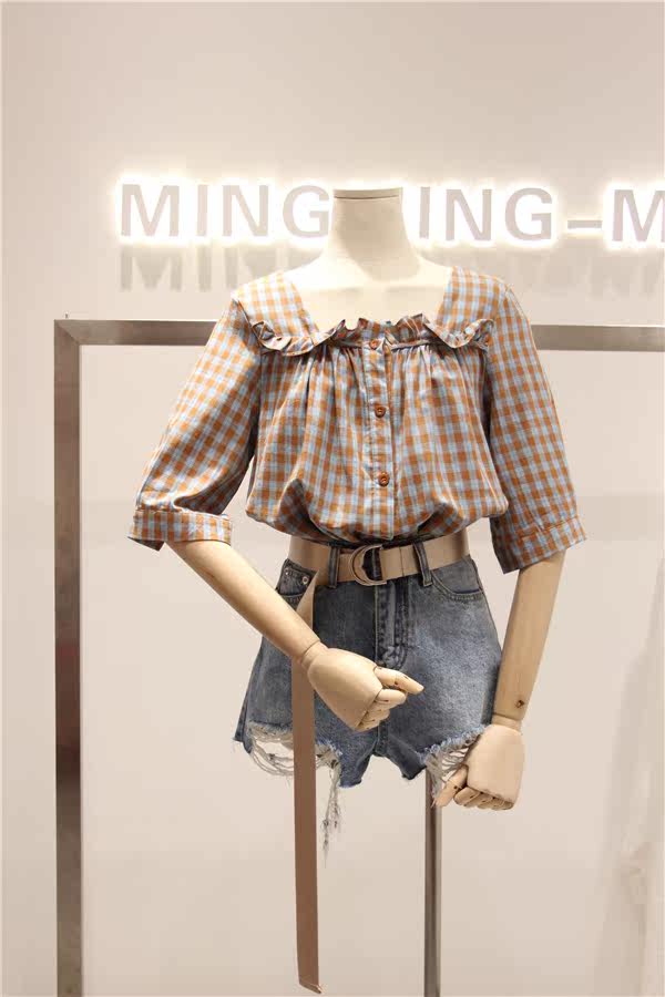 这款经典格子融合小方领娃娃衫设计,看起来很有小清新邻家女孩的感觉