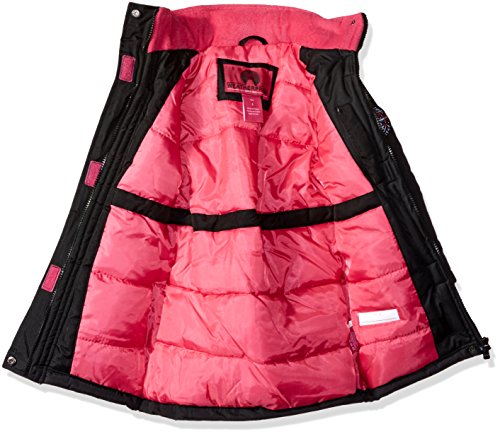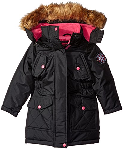 Multi pocket bubble coat with attached hood trimmed in faux fur