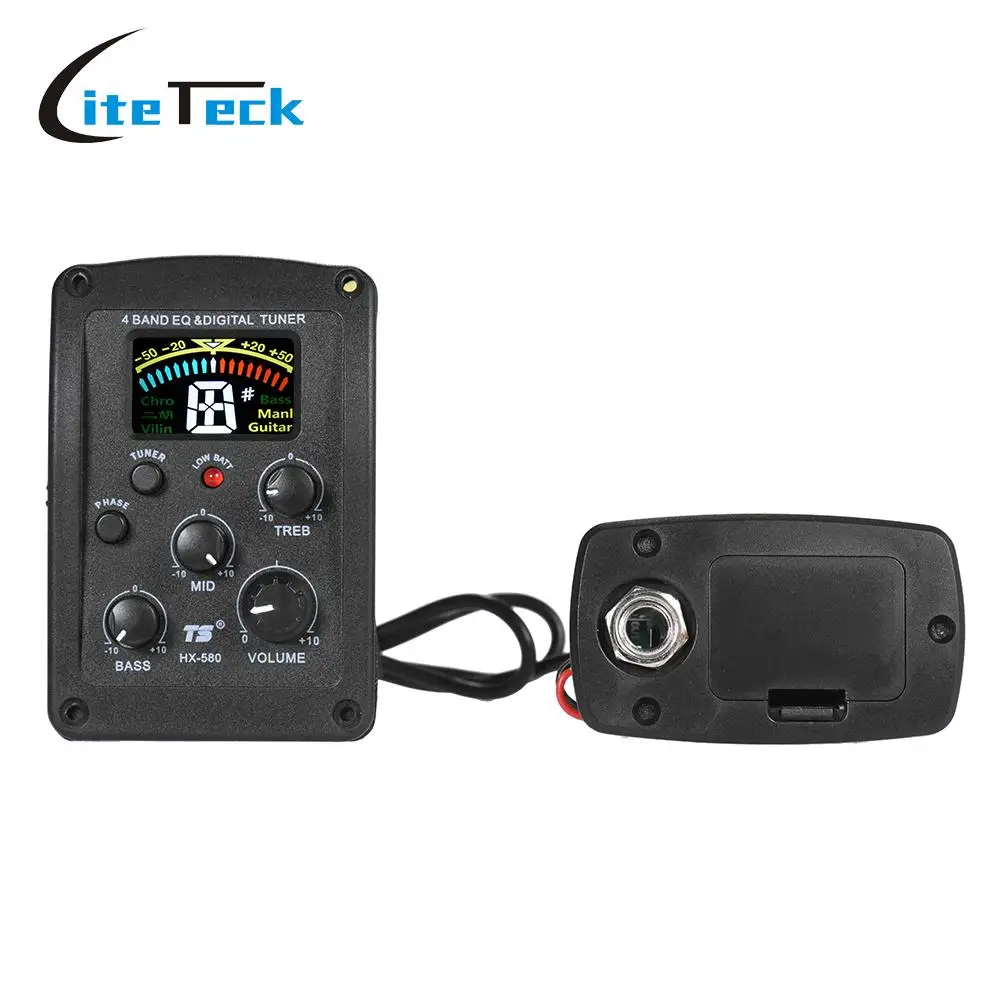 Pickup, tuner and equalizer system for acoustic guitars.