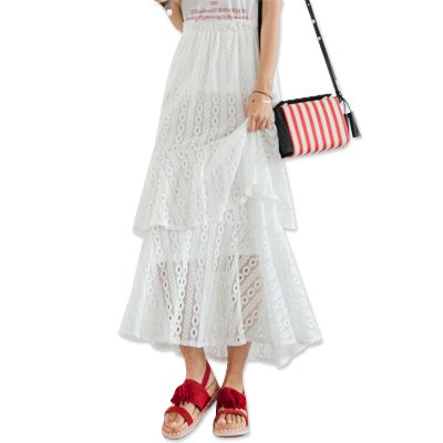 -. Feature : ユニークでフェミニンなレースロングスカートです。レーヨン混紡のレース生地で伸縮性が良く、ウエストはゴムなのでリラックスした履き心地です。斜めの裾ラインがユニークで、2段のフリルと透け感のあるレース生地がフェミニンさもプラスしてくれます。ホワイトカラーは裏地がありますが透け感がございますのでスキンカラーのインナーと着用してください。 / カラー : White/Black    Size:Free(S-M) / ウェスト幅 : 28Cm   ヒップ幅 : 44.5Cm   着丈 : 94Cm / 素材:ポリエステル75%+レーヨン25% / 洗濯方法 : 手洗い