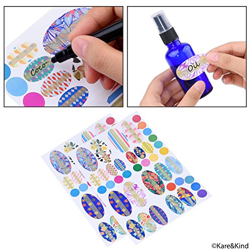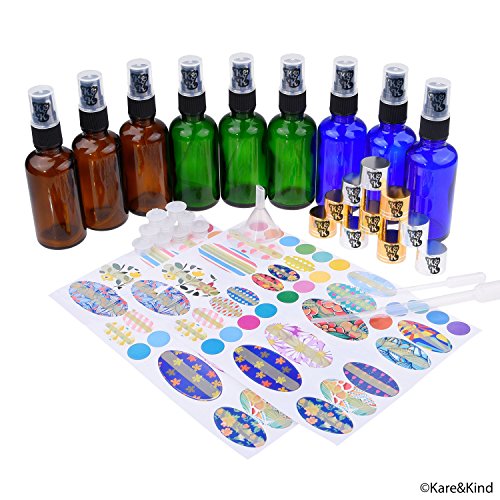 - The Kare & Kind Essential Oil Bottle Kit includes 9 bottles (3 different colors), 9 fine mist sprayers, 9 orifice reducer caps, 9 sealing caps, a tool to open/seal the bottles, 78 stickers for labelling (4 different sizes), 2 mini droppers and a mini funnel for easy filling.