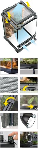 There are over 6,000 species of reptiles and over 4,000 species of amphibians, varying in size from around an inch to several feet. The terrarium is without doubt the most important aspect of successful reptile and amphibian keeping. Many species have different requirements, so a versatile and easily adaptable terrarium is essential. In order to meet the needs of the hobbyist and more importantly, the needs of reptiles and amphibians, Exo Terra developed a wide range of terrariums. All of these terrariums can be used for several applications and set-ups; from sterile housing to a state-of-the-art natural terrarium, from a desert terrarium to a tropical terrarium. Although very similar in shape and size as the “aquarium-type” tanks, these new versions have all the great features of the typical Exo Terra terrarium.