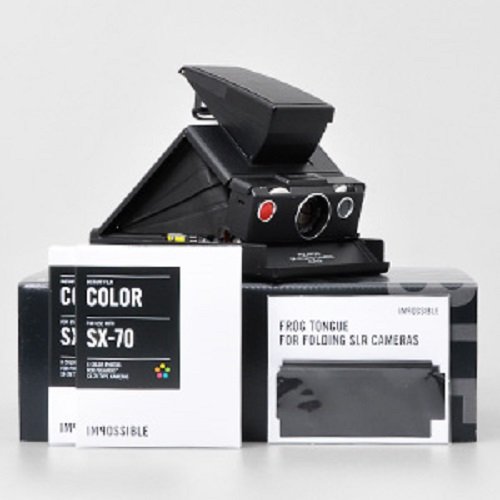 This kit contains a carefully refurbished black PolaroidTM SX-70 camera (Alpha or Model2 camera), two packs of Color instant film for PolaroidTM SX-70-type cameras and the Frog Tongue for folding SLR Cameras to protect your images from the light. Note: the camera in this kit is in excellent working condition but may show slight signs of wear. Features Original, refurbished black PolaroidTM SX-70 camera (Alpha or Model2) Professional folding SLR instant camera Lens: 4-element 116mm f/8 glass lens Shutter: Electronic shutter Focusing: Manual via geared wheel Exposure times: Automatic shutter speeds from >10 sec to 1/175 Aperture: Aperture range f/8 f/90 Includes two packs of color film for SX-70 Includes Frog Tongue for folding SLR Cameras Works with Color and Black and White Film for SX-70-Type Cameras