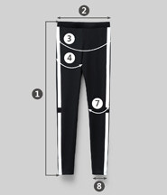 | 尺码 | ①裤长 | ②腰围 | ③臀围 | ④大腿围 | ⑤前裆 | ⑥后裆 | ⑦膝围 | ⑧脚围 | ||