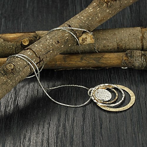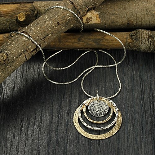 The pendant combines different sizes and textures of circles and a disc for a special and unique look. Mixed metal designs are always very fashion forward. This Necklace design is timeless, elegant and versatile to fit any style.