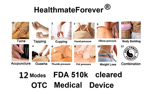 - Feature : HealthmateForever Electrotherapy Device: 12 preprogrammed massage modes in a rectangle design: Tuina (Push & Pull), Acupuncture, Tapping, Guasha (Scraping), Cupping, Shiatus (Finger Press), Pressure, Back Pain, Deep Tissue Massage, Body Building, Weight Loss, Combination / Adjustable 10-80 minute timer, 20 levels of adjustable intensity/strength (20 per output) / Independent dual output design, Customizable intensity and mode for each output, Allows 8 pads to be used at the same time / Rechargeable internal lithium battery - up to 10 hours of continuous use / Back-lit Touchscreen LCD Display. The kit includes: 1 HealthmateForever T12AB2 device, 8 piece self-adhesive conductive reusable gel pads, 4 sets of electrode wires, 1 USB Charger/Wall Unit, 1 pads holder, 1 stylus pen, 1 beltplus, Operating Manual, Acupuncture placement point chart, Lifetime Warranty Card, BONUS: Free Educational Reference Booklet